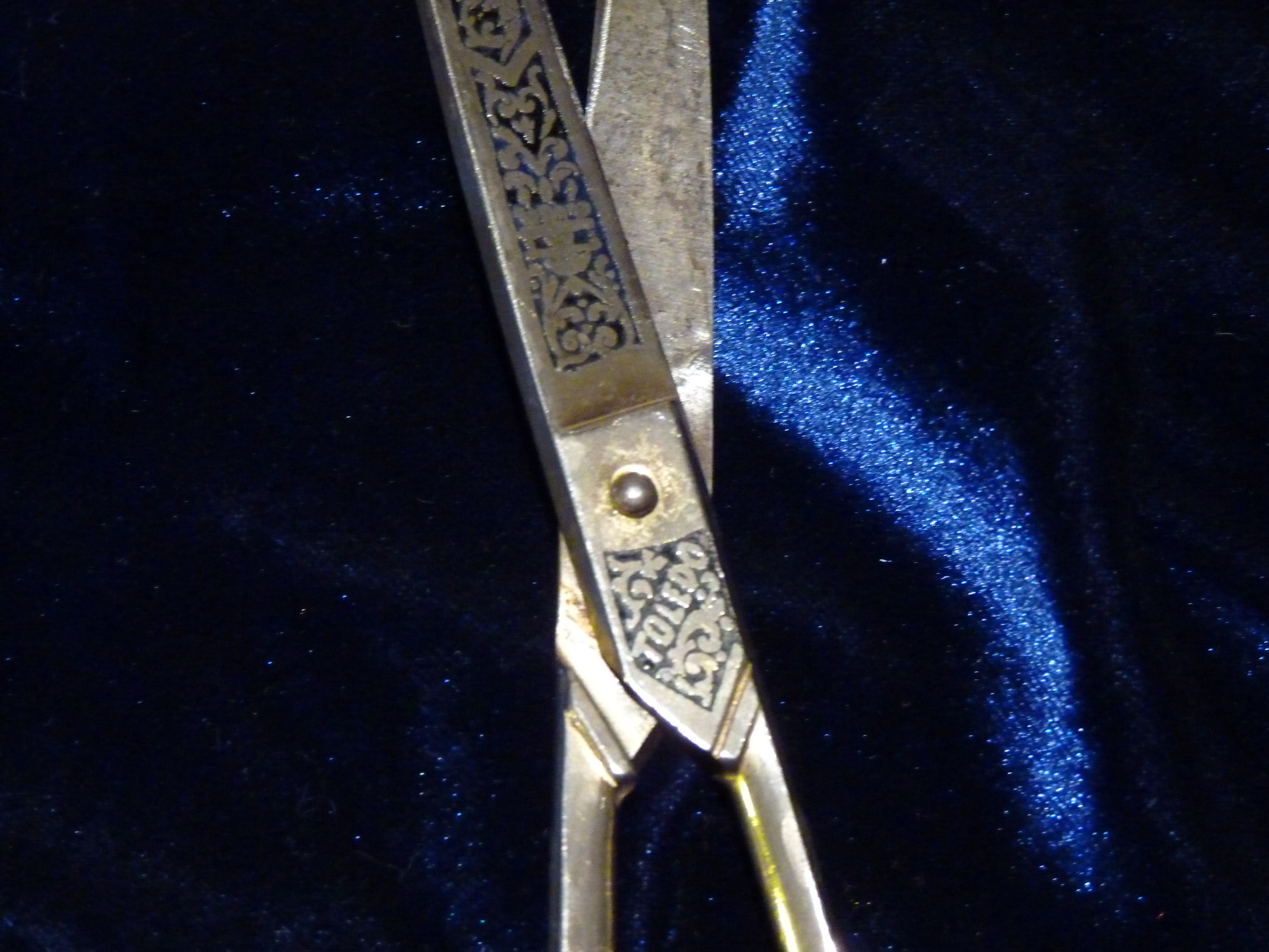 I have a pair of scissors I bought in Toledo, Spain in 1984. Everyone knows the connection between Toledo and El Greco, but the city was also once famous for its swords. I could neither afford, nor did I want a sword, but I most definitely wanted a keepsake that would capture their essence.  Every tourist shop was filled with swords and knives, and cutlery characterized by the basic inlay of gold or silver known as damascene ware. The design was different from anything I saw back home, and after much thought, I decided a pair of scissors would be the perfect souvenir. Not only pretty and unique, but functional. They were packaged in a black velvet pouch.  The pouch is long since lost, but I always know where those scissors are because they define a moment in time.