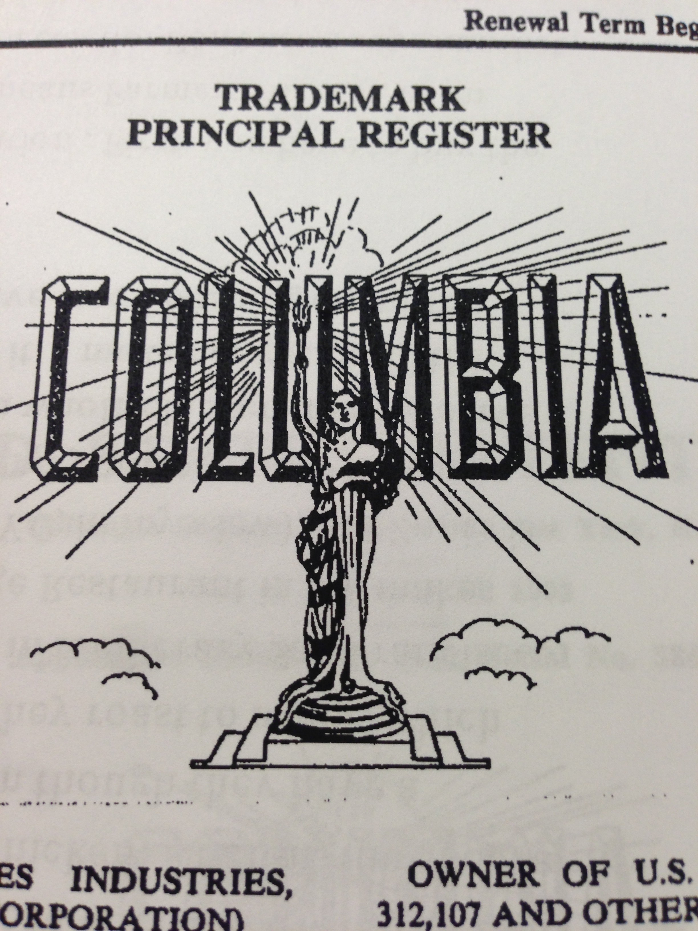 According to records at the Trademark Office, on March 15, 1926, Columbia Pictures Corporation, a New York corporation with an address at 1600 Broadway (home these days to a luxury condo on Times Square and the M&M store), filed an application to register a trademark. The trademark consisted of the words COLUMBIA PICTURES laid within a circle, inside of which held a helmeted woman looking as if she hailed from the wars of ancient Greece. She is wearing a breastplate, and holding a torch, as if she is running in the Olympics. We see her from the waist up – a reflection of herself because her gaze falls to the left. Columbia Pictures claimed it had been using the trademark on moving pictures since January, 1924.