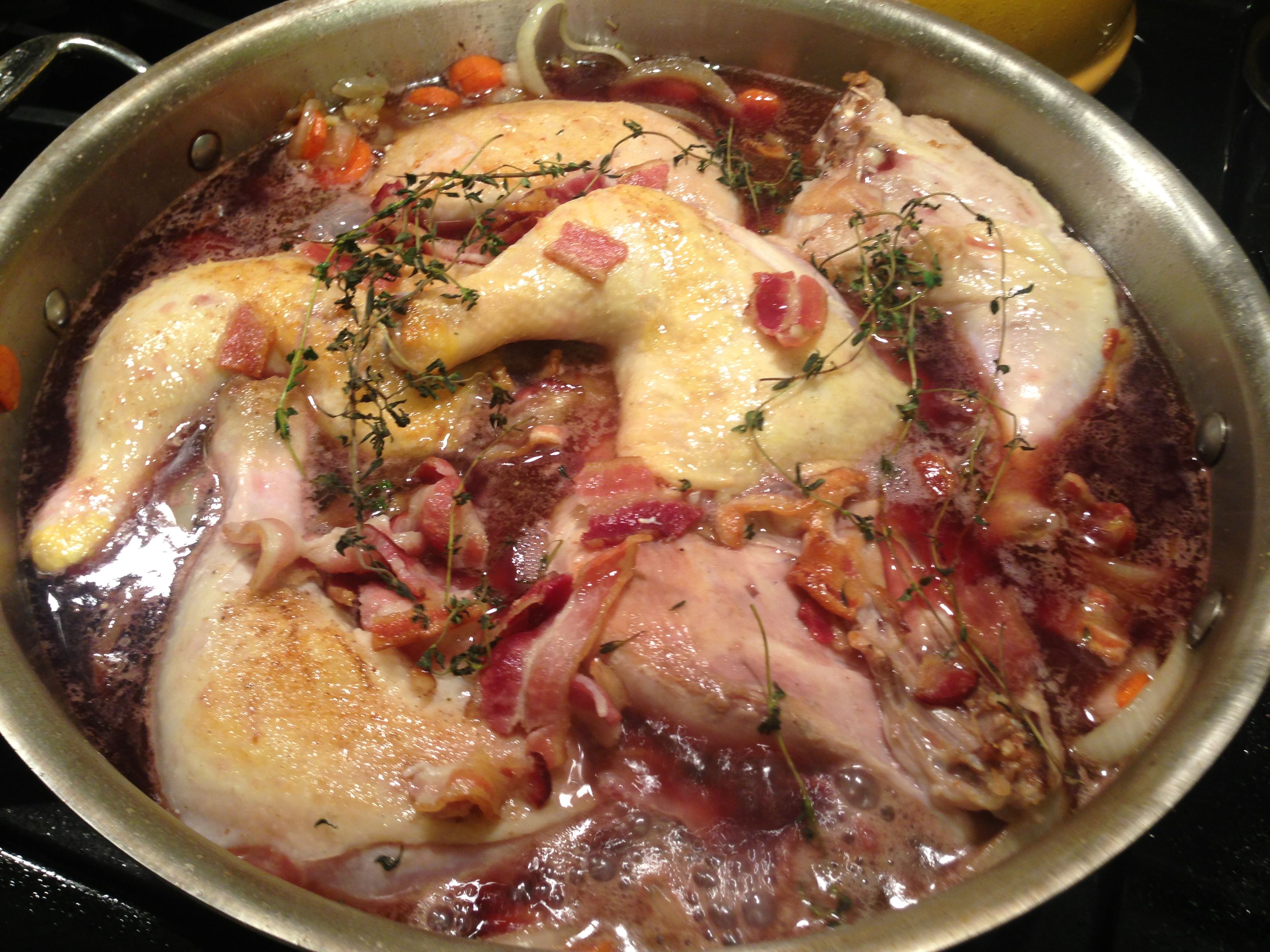 Coq au Vin: Blanched, Boiled, and ‘Blueprinted’ Below 05 Sunday Jan 2014 Original size at 3264 × 2448 ≈ Leave a comment Chicken, bacon, cognac, wine, carrots, onions and garlic simmering